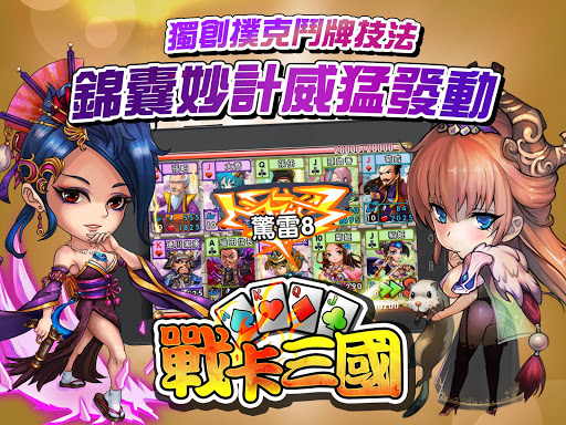 「戰卡三國」是一款融合撲克、三國及戰國知名武將卡牌,全新鬥智玩法的手機遊戲,快速上手、玩法多元,讓你和歷史上知名的各國武將們一同結伴,一統戰國,縱橫三國!