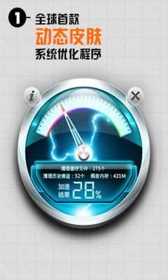 全球首创吹气加速、动态主题皮肤的系统优化大师,是最简单便捷的手机垃圾清理和内存清理软件。'炫丽界面、吹气优化、一键清理',为您的手机360°垃圾清理、系统优化、开机加速等。自动加速,设定某个时间段开启系统加速垃圾清理功能,省力又省心;白名单,系统清理时不会结束白名单列表里的应用,加速更安全;桌面悬浮窗,让用户通过手机桌面就启动加速器系统清理功能,实用且个性;上网加速,可以进行网络流量监控及上网加速,手机需要获取ROOT权限。手机加速器能有效的提升手机运行速度,节省电量,提高电池续航能力,是您贴心的手机管家。