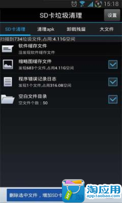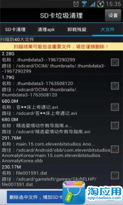 安装包、以及无用的大文件,轻松帮您的SD卡“减肥”腾出SD卡空间,让您的手机摆脱顿卡、速度慢等