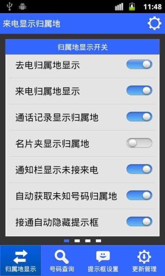来电显示归属地[1.6.4]来电显示归属地是一款界面最简洁、操作最简单、归属地显示最全的免费来电归属地显示软件! 功能特点:1、集全国最新最全号码段数据库;2、支持来去电归属地悬浮窗显示;3、可自定义调整归属地窗口位置;4、可选择提示框样式、显示透明度;5、可自定义文字大小、文字颜色;6、一键免费更新归属地数据库;7、数据库更新勤快,智能纠错;8、界面清新,操作简单、方便;9、智能省电模式、占用内存低;10、智能IP拨号,为你节省手机话费。