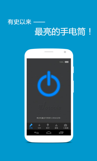 有史以来最亮的手电筒!iphone的设计,小米的风格,完全免费,操作简单,一开即亮,省电省内存。适配超过1000款机型,能够点亮绝大部分手机,覆盖度最广。充分发挥闪光灯和屏幕的作用。