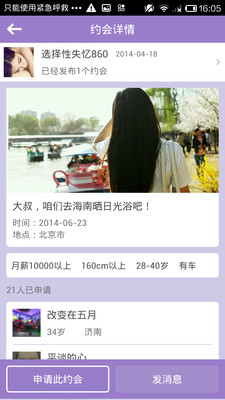 找大叔是一款基于地理位置的专门为妹子和大叔(年满28岁的优质男青年)量身打造的社交应用,在这里,妹子、大叔可以快速发现、参与身边有意思的约会,同时也可以按心愿发布约会。在这里,妹子可以和优质大叔做朋友,大叔可以结识到可爱萌妹子和性感女神;在这里,双方通过线上交流到线下活动更深入的了解,自然的从虚拟走到现实,轻松找到新朋友。
