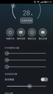 护目镜增强版致力于做安卓平台最好用的护眼/色温调节软件,护眼省电!护目镜能在晚上使用手机时获得更低的屏幕亮度有效保护您的眼睛,同时也支持调节屏幕色温,新版本大幅改进了软件界面与功能模块,更加方便更加实用!