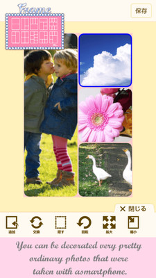 切,切削,照片处理能力相结合。它是一个照片编辑功能相结合的两个或更多的高达八个,一个固定的,可自由布置在多达15张的多个,可以是在该帧的自由布局或布局。