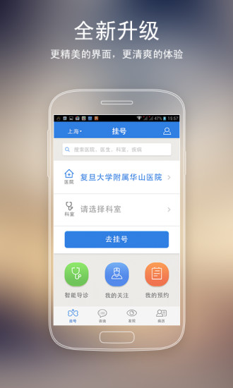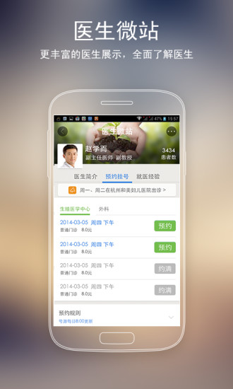 挂号网(Guahao.com)为卫生部批准的全国健康咨询及就医指导平台官方网站,致力于打造实名医患交流的互联网媒体平台,是目前国内最大的预约挂号、就医指导、健康咨询、在线支付的医疗健康服务网站。*预约挂号聚合了全国超过400家重点三级医院的预约挂号资源,目前拥有全国三级医院28万名医生的专长库,已成功的帮助了全国超过1200万用户'找对医生挂到号'。*搜索医生提供精确的全国三级医院28万名医生的搜索,包括医生的专长。*收藏医生可以收藏自己关注的医生。*预约管理用户可以对自己预约进行处理。