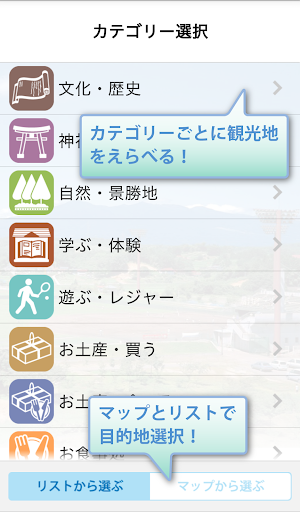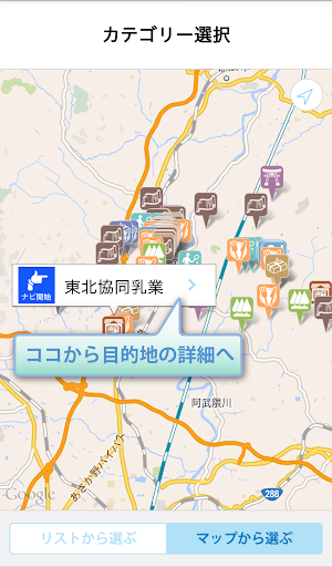 2.リストかマップの中から目的地を設定します。右側の「>」をタップすると目的地の詳細情報が表示されます。そこから目的地を設定することができます。