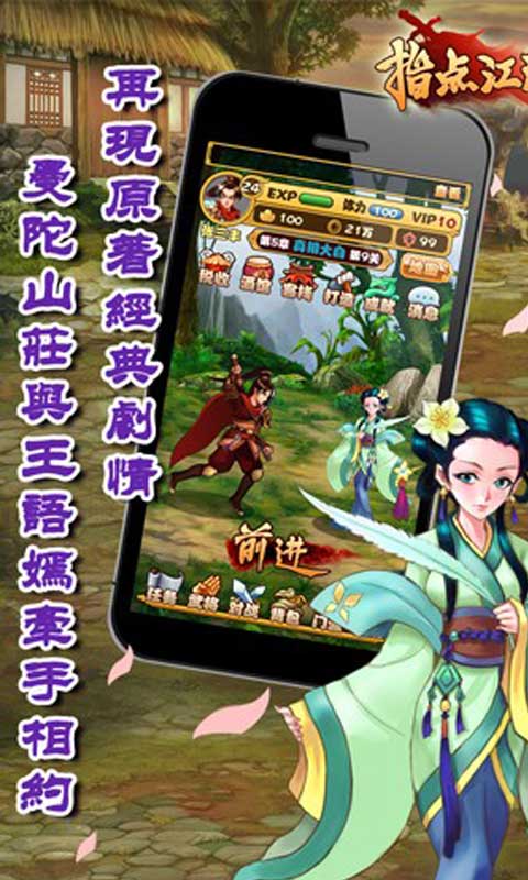 指点江湖OL安卓版是一款十分具有策略性的卡牌游戏,一款纯武侠风格手游。进入刀光剑影的世界直面江湖英雄儿女,就是拿起手机那么简单。江湖对于孤身闯荡的你来说是一个人的江湖,江湖对于面对天下英雄的你来说却又不是一个人的江湖。天下五绝,少林三神僧,江南七怪,全真七子,光明四法王,黄药师一家六口。 称霸武林技压群雄,众多美女等你征服。江湖儿女自古多情,小和尚虚竹有梦姑银川公主,段誉有神仙姐姐王语嫣和一干妹妹,乔峰有阿朱阿紫姐妹花,杨过有小龙女和一干仰慕者,王重阳有林朝英,老顽童周伯通有瑛姑,连傻傻的郭靖都有黄蓉和华筝这一超强替补,由此可见英雄豪杰身边怎能没有美人陪伴闯荡江湖。游戏中有众多美貌与武力并肩的江湖女侠,如果你想征服她们,没有实力可是不行的。 2014-03-18更新v0.7.2.6