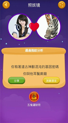 你想知道你的未来伴侣是人或者是妖吗?你现在的伴侣是否真的适合你呢?快来试一下指纹照妖镜,让你看清未来幸福大路,赶紧来玩玩吧!