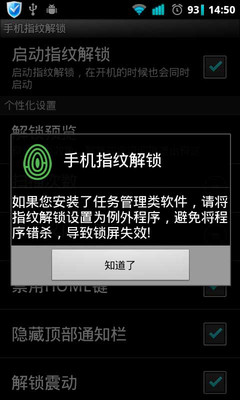 软件原理:软件通过用户指纹式样的扫描来解锁手机(由于当前手机硬件限制,无法真正识别用户指纹)。扫描次数对应滴滴音或手机震动,具体成功次数用户可以自行设置,扫描次数错误会出现"授权失败"字样,无法进入软件解锁,当扫描次数和用户设定次数一致才能正常解锁。