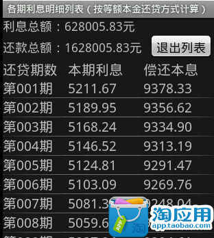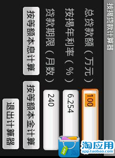 {软件介绍} 按揭贷款广义来说是指借款人以一定条件从银行获得贷款后,借款人按照按揭契约中规定的归还方式和期限分期偿还给银行,银行按一定的利率收取利息的贷款方式。归还方式通常分为等额本金和等额本息。本按揭贷款计算器操作简便,使用者只需输入按揭贷款的贷款总额(万元)、按揭贷款的年利率(%)和贷款期限(月数)3个数据项,便可按不同的归还方式,准确地计算出该项贷款到期应付的总利息额和总还款金额,同时列出每一期的利息额和偿还本金金额。在正常退出计算器时,程序把输入的3个数据项保存下来,在重新进入按揭贷款计算器时会把其自动填入相应输入域中。如不需修改这些数据项,使用者只要点击相应的计算按钮便可得到相应的计算结果。本按揭贷款计算器既可在贷前进行测算,根据自己的偿还能力确定贷款总额和期限以及还款方式。也可在贷后每期还款时作为核算扣款的工具。