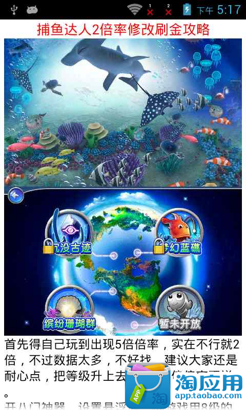 捕鱼达人2是风靡全球的休闲类游戏捕鱼达人的续作,新版的游戏不仅继承了原版游戏的特色,还在原有基础上添加了许多新的内容,如新的游戏场景以及新武器等。捕鱼达人2金币修改,高手试炼,安卓亲测,攻无不克战无不胜!爱捕鱼游戏的,不妨看看吧!