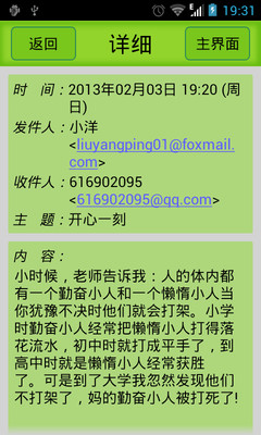 掌上邮是一款Android平台上的邮件收发应用,支持QQ邮箱、网易(163和126)邮箱及新浪(.cn和.com)邮箱自动配置,支持各种邮箱(包括公司邮箱)手动配置,可以向其他任何邮箱发送邮件。软件操作简单快捷,是您出行办公的好帮手!