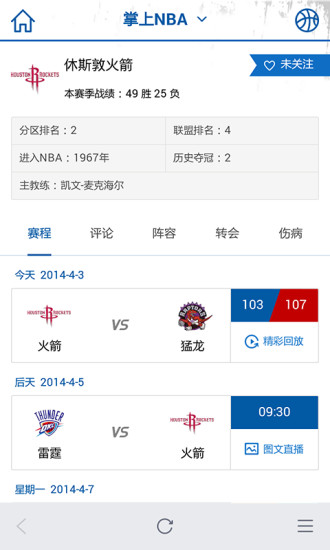 集赛程查询、赛前竞猜、比赛直播、统计查询、排名查询、球员球队查询和资讯阅读于一身的NBA赛事产品