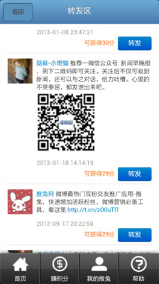 推兔是新浪微博的一个完全免费的第三方工具应用,它是一个新型的为广大草根微博账号服务的互粉,互推平台,它基于积分的方式,极大的提高了用户的积极性和互粉效果,有效的屏蔽了僵尸粉,使大家更开心有效的玩转微博。