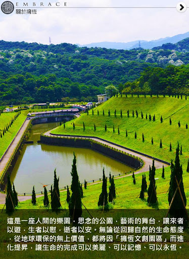 這是一座人間的樂園,思念的公園,藝術的舞台,讓來者以遊,生者以慰,逝者以安。無論從回歸自然的生命態度,從地球環保的無上價值,都將因「擁恆文創園區」而進化提昇,讓生命的完成可以美麗、可以記憶、可以永恆。