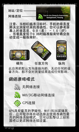 除了測量方向,攝像指南針將會自動檢測及使用當前準確性最高的網絡連接模式(Wifi,3G或GPS)來獲取您目前的位置,坐標,海拔及地址,並在屏幕上顯示出這些信息。