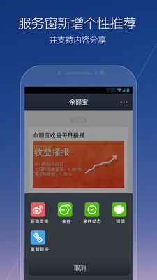 支付宝钱包内置风靡全国的平民理财神器“余额宝”,还有还信用卡、转账、充话 费、缴水电煤全部免费,有了钱包还能便宜打车、去便利店购物、售货机买饮料,更有众多银行和品牌商家的精品服务。你和1亿多钱包用户一起,好钱包,很安全,会赚钱,更懂生活!