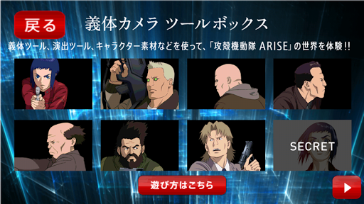 '攻殻機動隊ARISE AR2アプリは、2014年6月28日より公開される『攻殻機動隊ARISE border:3 Ghost tears』と連動したARイベント専用のスマートフォンアプリです。アプリ内にあるツールボックスから画像を選択(複数選択可能)頂くと登場キャラクターや劇中シーン、義体化など様々な写真を撮る事が可能です。