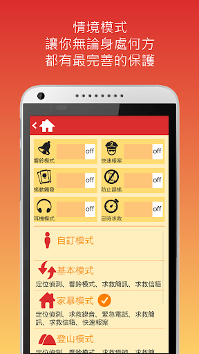 我們也首創了情境求救模式,將各種求救訊息通知方式(例如:閃光燈求救、響鈴求救、簡訊通知親友、eMail通知、電話快撥、通知警方、FB發佈等),依據不同的使用情境歸類,讓大家容易上手。