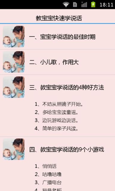 3岁前是孩子学说话的宝贵时期,因为3岁前是人语言发展的关键期人类说话能力是在后天所获得的一个听与发音器官健全的孩子只有处在有语言交流的环境中,即有人和他说话,孩子语言能力才能得到发展下面是根据蒙台梭利研教育法究出来的宝宝学说话的最新技巧