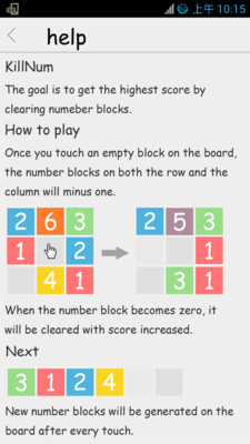 这是一个益智的数字消除游戏,每次在棋盘上会随机出现几个数字,在空白处点击会将所在行和列的数字减一,当数字减为零时被消除,这款游戏没有结束,不断挑战自己获得最高分,通过使用游戏中的炸弹和回退可以得到更高分。