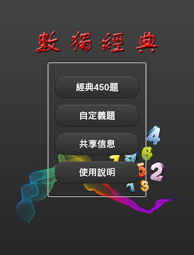 共有450個經典的數獨遊戲,按難度分成9級, 每級50個。此外還提供了自定義錄入和分享導入的功能。