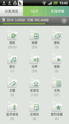 体贴的分类让您可以快速的找到音乐、图片、视频、主题、安装包、文档、压缩包等文件,蓝牙接收分类还能让你快速找到通过蓝牙接收的文件。