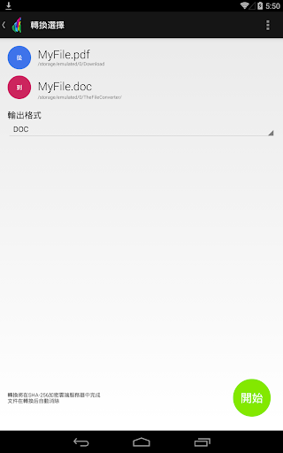 注意:你的文件將被發送到一個經SHA-256加密的,安全的轉換服務器中進行轉換。文件被加密,在轉換后將立即刪除或註銷,你應該了解,使用這個應用程序表示你同意將你的文件發送至網絡的轉換服務器中。