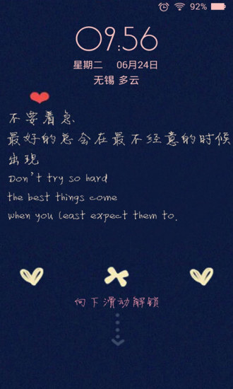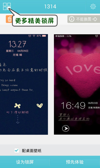 这是一款文字控的主题锁屏,喜欢文字的可不能错过哦!1 点击预先体验,如果您满意的话就可以设为锁屏。2 点击混淆背景,里面有大量的背景图资源,可以实现换背景的功能。3 点击设置键,里面有更多设置,比如数字密码解锁,九宫格解锁。4 点击左上角的设置按钮,里面还有更多的网络精选,喜欢的赶快来试试吧!5 按住屏幕空白处往下滑动,即可打开音乐播放器