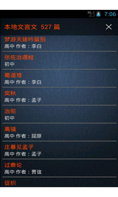 小学、初中、高中语文文言文赏析大全,包含对所有1-12年纪语文课内外所有文言文的原文、读音、翻译、赏析、作者、出处等详细内容。支持本地化搜索和网络搜索!应用完全免费,纯粹为了方便大家学习使用!后期将推出更多功能方便大家!