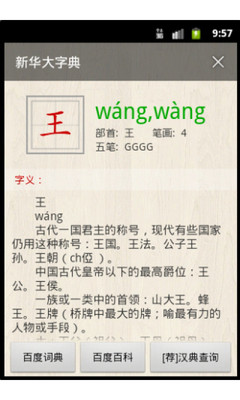 《新华大字典》完善收录了2万多汉字,界面精美,查询简单快捷,同时支持中文、拼音、部首和五笔进行本地查询,同时也百度百科、百度词典和汉典进行网络查询,让您的查询结果更精准。软件完全免费,完全为方便大家开发!