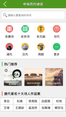 精选2万多首:包括中国各个时期(从当代到周朝时期)所有诗词的精选,内容除了诗词外我们还提供了注解和作者介绍。