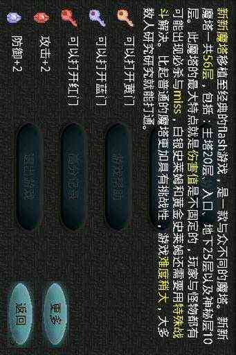 新新魔塔一共56层,包括:主塔20层、入口、地下25层 以及神秘层10层。此魔塔的最大特点就是伤害值是不固定的,玩家与怪物都有可能出现必杀与miss。比起普通的魔塔更加具有挑战性,游戏难度稍大,大多数人研究研究就能打通。