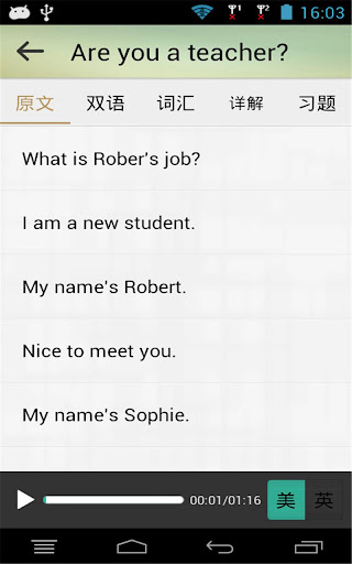 超酷的書籍閱讀學習體驗,配以核心單詞、精心詳解、課程輔助練習題目,並可靈活設置顯示字體、設置順序(循環)播放體驗,讓你在手機上輕輕鬆松完成經典英語教程的學習。