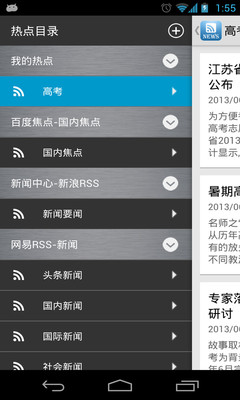RSS是一种订阅互联网上信息的方式。就像订报纸、杂志、短信服务一样,通过RSS,您可以订阅互联网上感兴趣的内容,例如:新闻、Blog、论坛帖子等。《新闻资讯聚合中心》汇入了大量RSS站点,把大量新闻信息汇总,用户只要打开软件就可以获取到各类新闻信息,软件以文本形式获取站点内容,速度快又节省流量。软件还提供了rss自定义添加收藏功能,可以收藏博客、网站的rss热点地址。