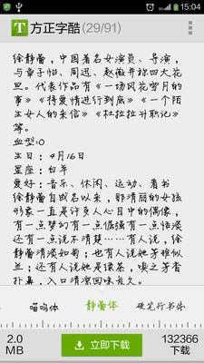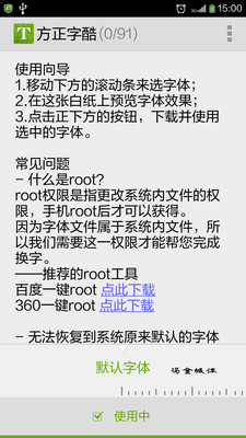 方正字酷增加了卓大师一键ROOT功能,是一款方便的手机字体更换软件,集合了几十款优质中文美化字体,有可爱的喵呜体、卡通体,清秀的静蕾体等多种字体;