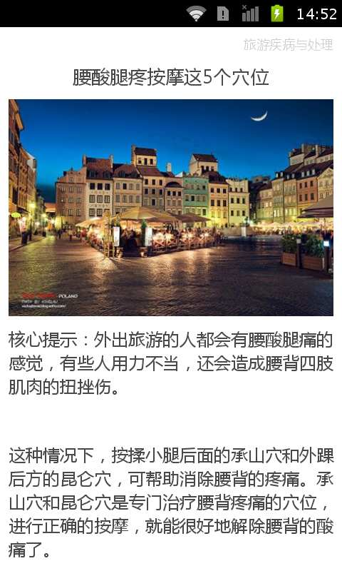 外出旅游的人都会有腰酸腿痛的感觉,有些人用力不当,还会造成腰背四肢肌肉的扭挫伤这种情况下,按揉小腿后面的承山穴和外踝后方的昆仑穴,可帮助消除腰背的疼痛承山穴和昆仑穴是专门治疗腰背疼痛的穴位,进行正确的按摩,就能很好地解除腰背的酸痛了