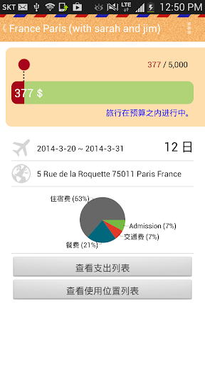 查看各账簿报告: 各支出类别的统计图表,预算与支出的对比结果,查看支出列表,各支出项目的详细信息,查看支出位置列表 (支持地图显示)