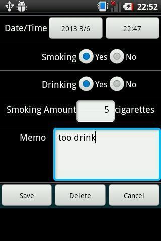 请吸烟日记写在这里。方便和易于使用的日历,你可以创建一本日记。需要写像写日记,写笔记。在一天中,你可以创建多个条目。如果吸烟和戒烟率贡献一个注意到的数量。饮酒,不论你可以写。希望这有助于你吸烟。快来下载吧。