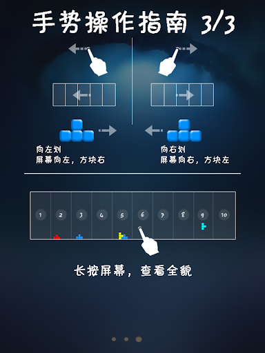 与其它的俄罗斯方块不同,我们的宽版需要用手指左右划屏来兼顾左右,按住屏幕可以看到全景缩略图.便捷的操作是我们游戏开发中最耗费精力之处,上划旋转,下划加速,希望会给你带来舒服的体验.按住方块下移,或许还能补救自己之前的错误.