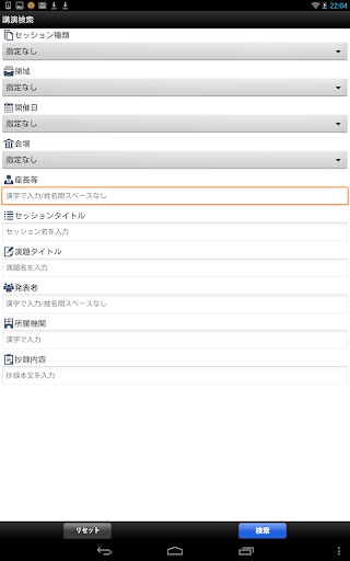 タイトル、発表者、セッション種類などで簡単に検索ができます。