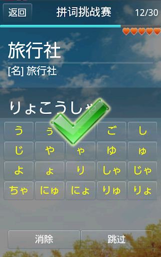 2.拼词挑战赛:输入单词的假名读音,帮助您巩固单词记忆。采用挑战解锁模式,每次挑战后有得分显示。