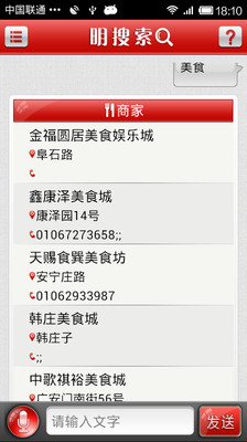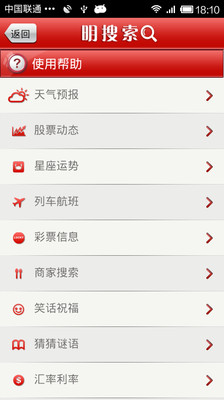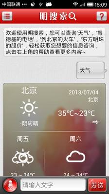"明搜索" Android Beta版是明复信息技术有限公司推出的一款兼并语音和手动输入实现自然语言搜索的客户端软件.软件提供各类出行,休闲娱乐,理财等信息的查询.信息面覆盖商家,列车,航班,天气预报,星座,笑话,谜语,祝福,电影演出,股票,彩票,汇率利率等多个领域.您可以使用语音录入"天气"或手动输入"天气",获取天气情况详情.使用同样的方式轻松获取更多领域的信息查询.