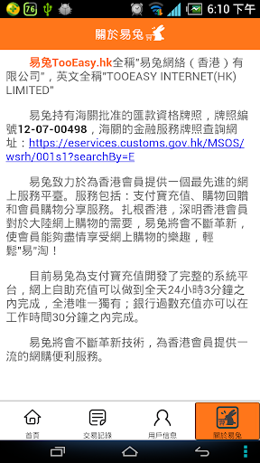 易兔(www.tooeasybuy.com)致力於爲會員提供優質全面的網購服務。現有服務包括易兔直購、支付寶代付、支付寶充值卡、支付寶購物卡、e集運等。