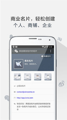 易友名片(KnowMe)是一款电子名片制作工具。打开App,添加名片相册以及名片信息,即可创建一张专属你个人、商铺或企业的名片。“易友”将成为联系的中间点,让信息传递更高效,更便捷。拥有一张自己的电子名片,让别人更容易了解你,并联系上你!