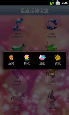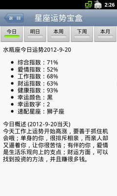 星座运势宝盒选择星座后将开启今天、明天、本周、本月、本年度的运势信息,还有星座配对,个性信息,星座来源,传说等多项内容,更有大量实时更新的星座新闻可以查看,星座文化等资料的分析,让你运气更好,更旺。