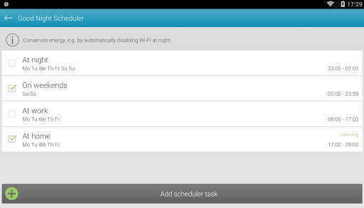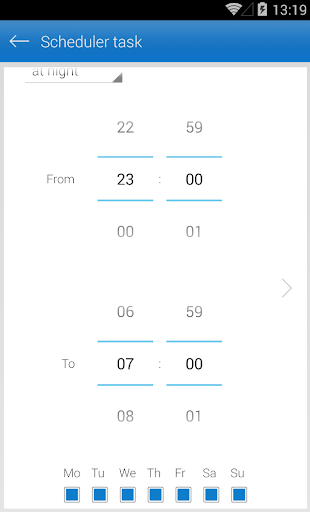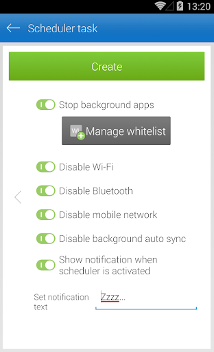 內建的 晚安排程 可以在您定義的時間期間內自動停用一些功能,如 WIFI 或是行動資料連線。 使用 晚安排程 讓手機在晚上自動進入睡眠,節省電池消耗。
