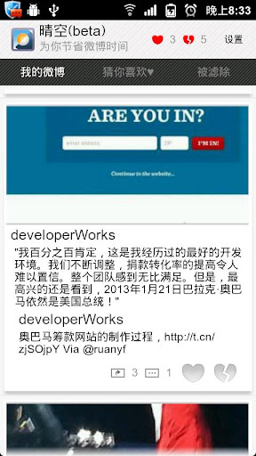 通过点击红心/心碎的按钮,晴空会收集到您的偏好信息,并以此来对微博过滤和分类.