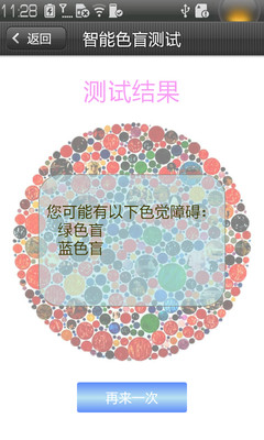 [智能色盲测试]采用国际标准《色觉检查图》,完全模拟现场测试的过程,智能选图,以最少的图片达到全面测试的目的,具备准专业级的判定准确率,方便、快捷。本软件可以对红色盲、绿色盲、红色盲绿色弱、绿色盲红色弱、红色弱、绿色弱、蓝(紫)色盲、蓝(紫)色弱、黄色盲、黄色弱进行定性和半定量检查。