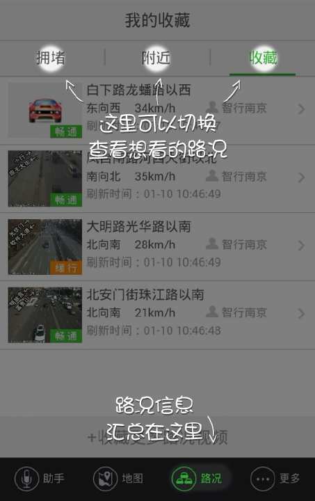 “智行南京”是由南京城市智能交通有限公司倾力打造的一款个性化智能交通移动应用软件。该系统利用遍布南京市主次干道的500多个监控点,提供由实景监控照片和电子地图定位组合而成的实时路况信息。此外,还结合了南京市机动车环保标志电子卡系统,采用RFID车联网技术,为南京市所有车主提供多种个性化的路况信息服务。